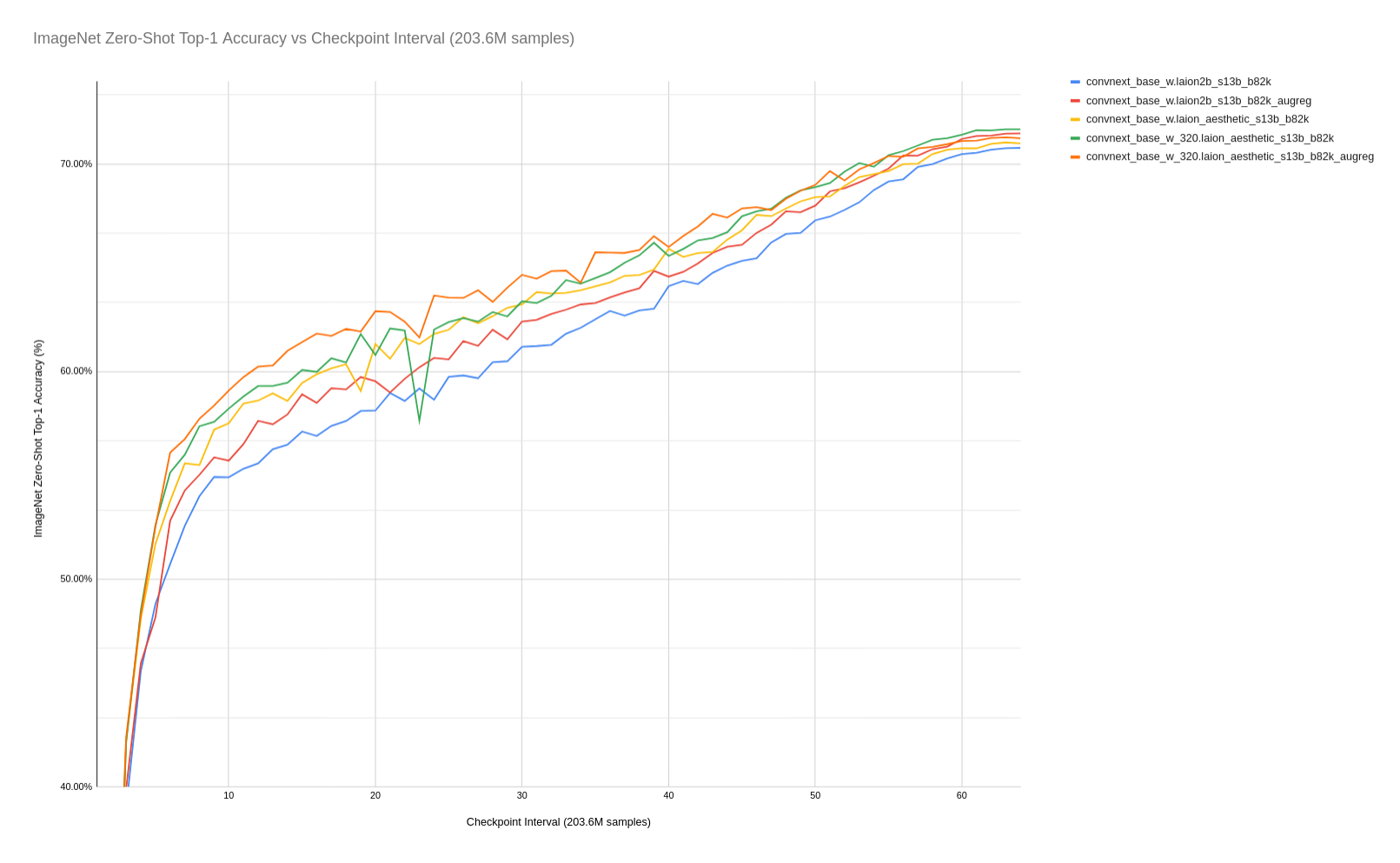 All models were trained with a global batch size of 81920 for 64 checkpoint intervals of 203.7M samples for a total of ~13B samples seen over training.